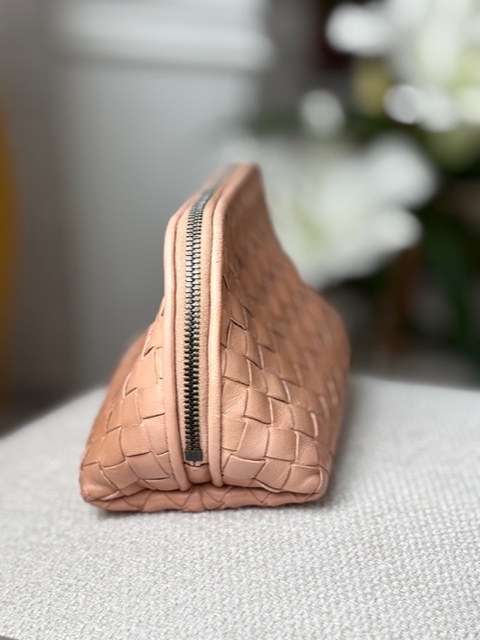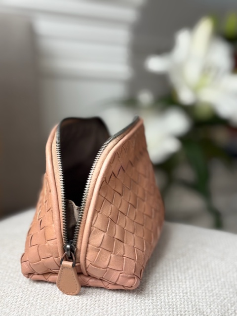 Kompakte Bottega Veneta Kosmetiktasche aus geflochtenem Leder (Intrecciato) in zartem Nude-Ton – zeitlos, elegant und in sehr gutem Zustand.