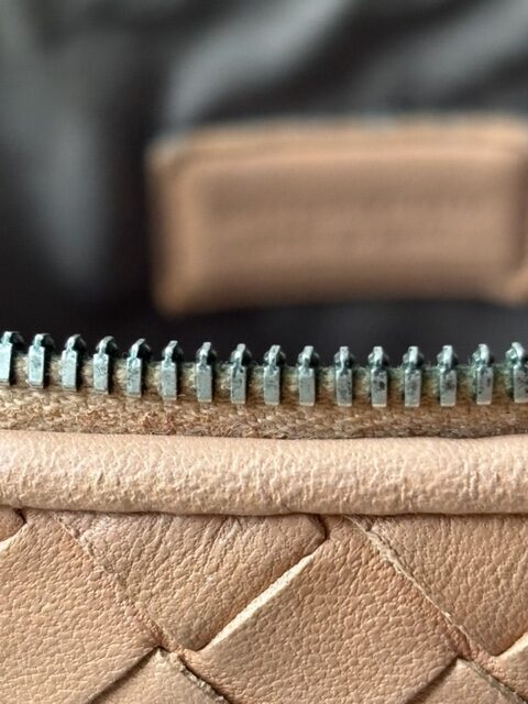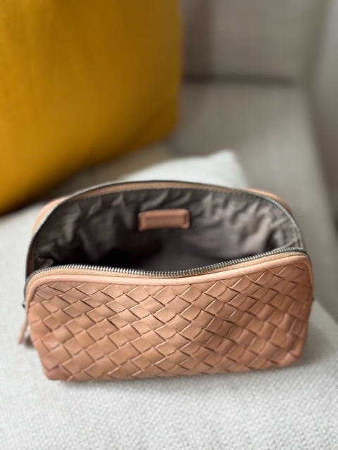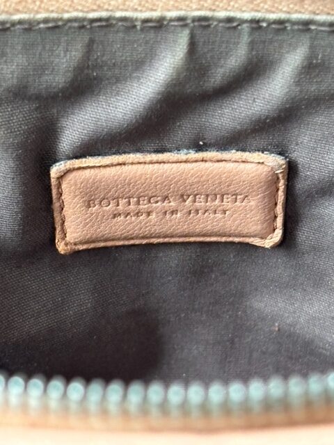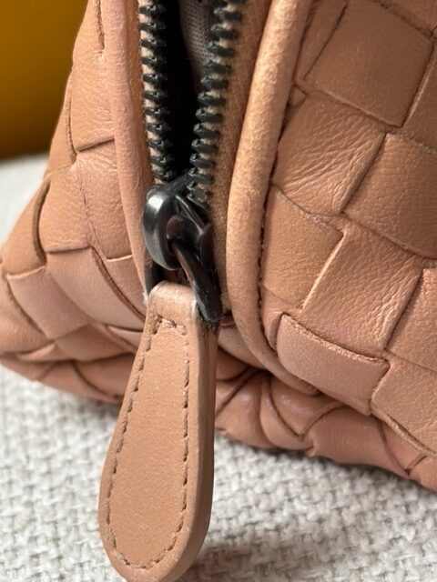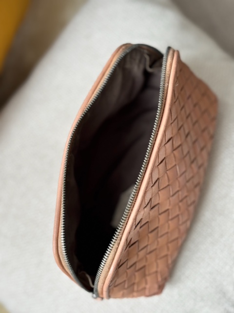 Das Leder befindet sich in sehr gutem Zustand und wurde sorgfältig gereinigt und gepflegt. Die Struktur des Flechtwerks ist gleichmäßig und weich, der Reißverschluss läuft sauber und stabil. Im Inneren bietet die Tasche ausreichend Platz für Kosmetik, Essentials oder Reiseutensilien.