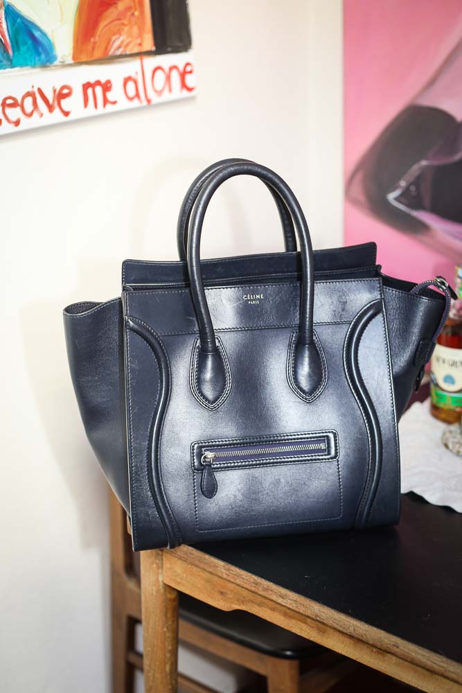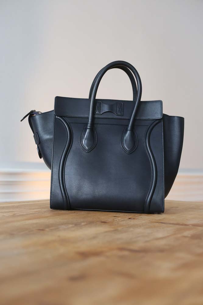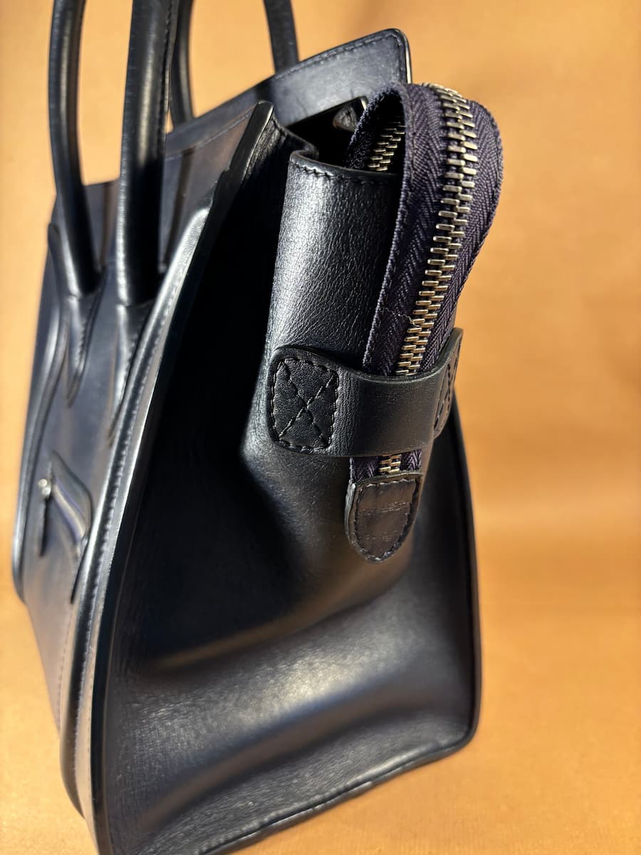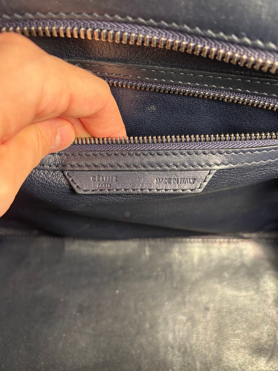 Ikonische Céline Luggage Mini aus glattem Kalbsleder in edlem Nachtblau (Ink) mit silberfarbener Hardware. Das charakteristische Design mit geschwungenen Nähten, dem mittigen Reißverschlussfach und den dezent ausgestellten Seitenflügeln verleiht dieser Tasche ihren unverwechselbaren architektonischen Look. Ein Klassiker aus der Ära Phoebe Philo – modern, strukturiert und zugleich zurückhaltend. Neupreis 2.200 € – 2.400 €.