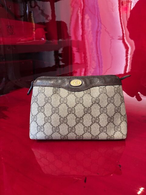 Authentische Gucci Vintage Kosmetiktasche aus der klassischen GG Supreme Linie, gefertigt in Italien in den frühen 1980er Jahren.Das Modell kombiniert das ikonische Monogramm-Canvas mit weichen Lederdetails in dunklem Braun und goldfarbener GG-Hardware – ein charmantes Stück aus Guccis eleganter Accessoire-Ära.
