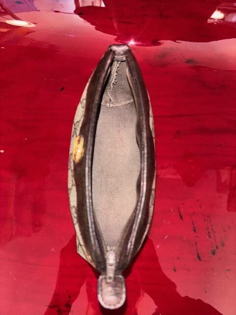 Die Tasche befindet sich in einem guten Vintage-Zustand mit leichten Gebrauchsspuren am Leder und an den Kanten, die ihren authentischen Charakter unterstreichen. Reißverschluss funktioniert einwandfrei. Ein zeitloses Sammlerstück und praktisches Accessoire – ob als kleine Clutch, Kosmetiktasche oder für den täglichen Gebrauch.