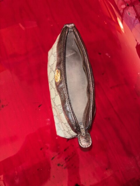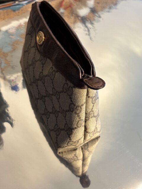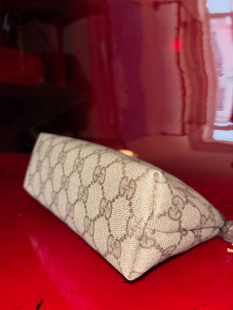 Die Tasche ist aus beschichtetem GG Supreme Canvas gefertigt, das durch seine wasserabweisende Oberfläche robust und pflegeleicht ist. Das Innenleben ist ungefüttert – ein typisches Merkmal dieser originalen Gucci-Modelle, die speziell für Kosmetikartikel entwickelt wurden. Neupreis war damals zwischen 180–260 €.