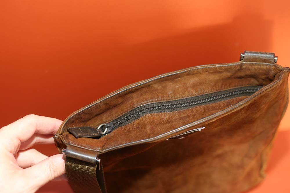 Insgesamt befindet sich die Tasche in einem guten Vintage-Zustand: leicht patiniertes Wildleder, innen sauber, Gurt und Nähte fest. Ein stilvolles preloved Original mit handwerklich veredeltem Detail.