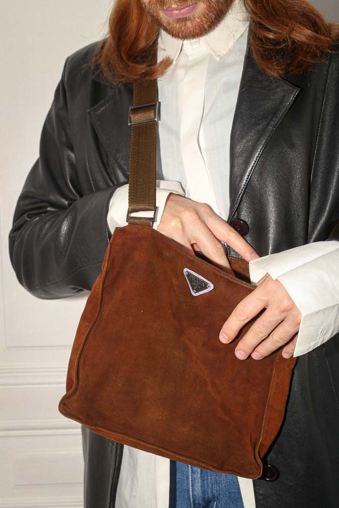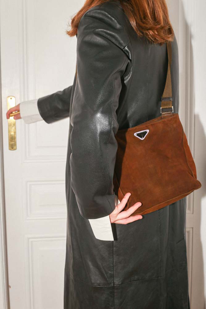 Seltener Vintage-Klassiker aus der späten 1990er-Kollektion von Prada: die Shoulder Bag B7433 aus der sportlich-eleganten Linie “Camoscio Sport”. Gefertigt aus weichem Wildleder (Camoscio) in der charakteristischen Farbe Loden – ein warmer, olivbrauner Ton, der perfekt zu den minimalistischen Entwürfen der Ära passt. Neupreis lag damals zwischen 850–1.050 €.