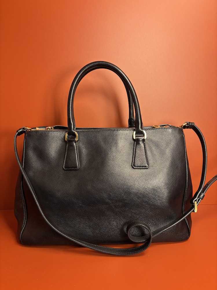 Ikonische Prada Galleria aus schwarzem Saffiano-Leder mit goldfarbener Hardware. In perfektem Zustand, inklusive Staubbeutel und Authentizitätskarte. Ein Klassiker der italienischen Handwerkskunst – elegant, funktional und zeitlos.