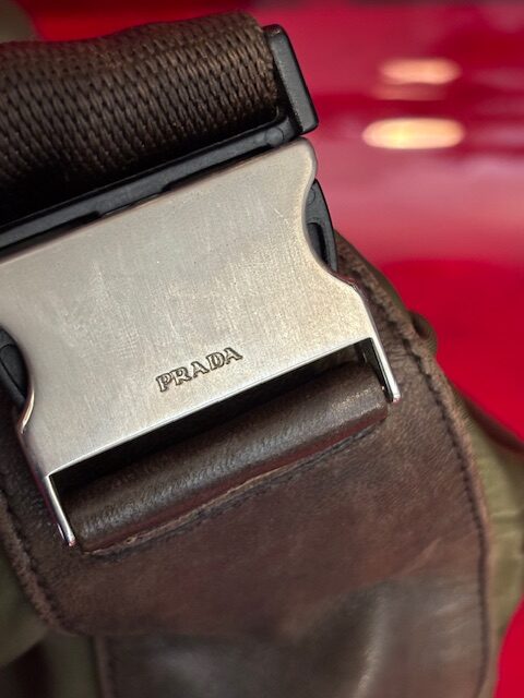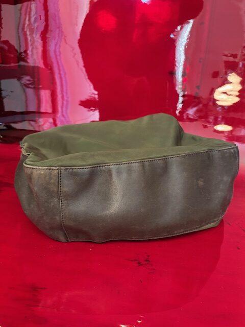 Sportlich-elegante Prada Shoulder Bag aus der ikonischen Tessuto Kollektion – gefertigt aus robustem Nylon in Olivgrün mit weichen Leder-Details in dunklem Braun. Die Tasche verkörpert typisch italienische Lässigkeit mit funktionalem Luxus und ist ein klassisches Beispiel für Pradas Designästhetik der frühen 2000er Jahre. Neupreis lag amals bei 750 €.