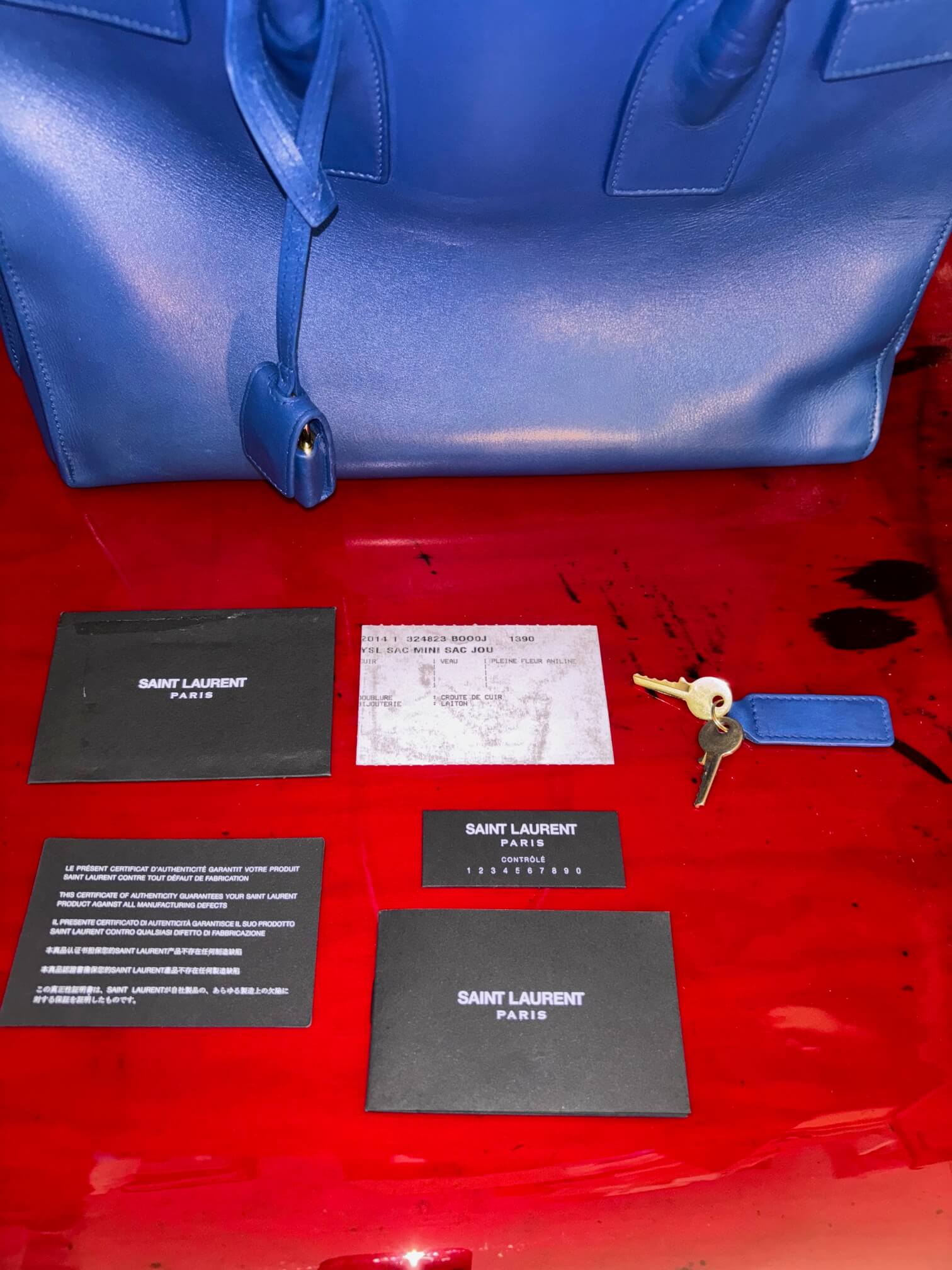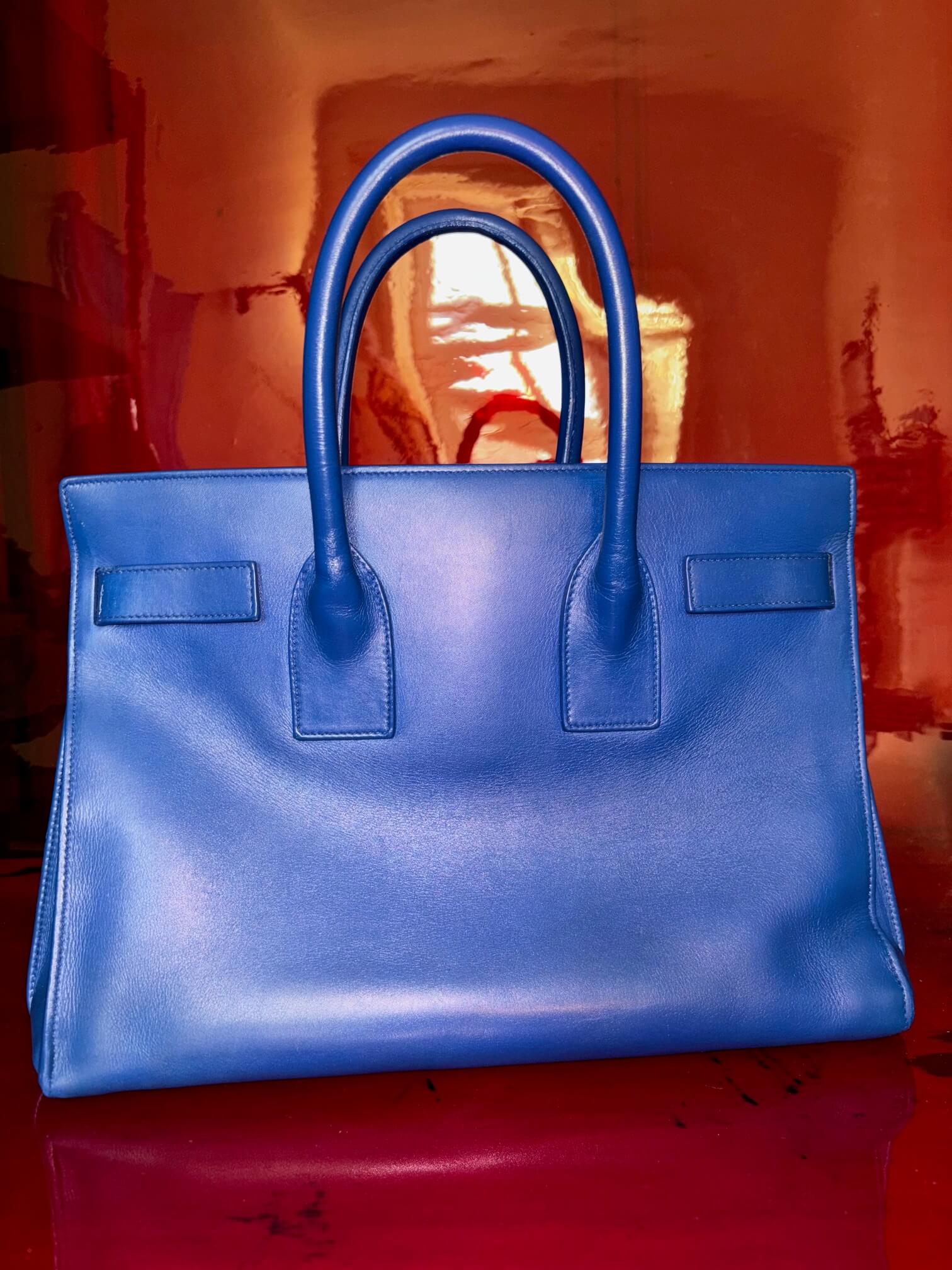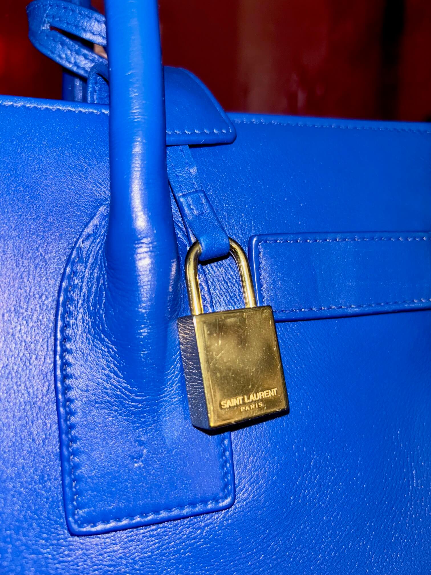 Saint Laurent Sac de Jour in Royalblau aus glattem Kalbsleder mit goldfarbener Hardware, Schulterriemen, Schloss, Schlüssel und originalen Unterlagen. Jahrgang 2014. Außen sehr gut, innen gebraucht – ein ikonisches Sammlerstück von Saint Laurent Paris. Neupreis 2.400 € – 2.600 €.