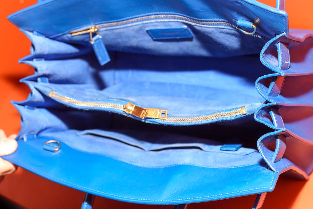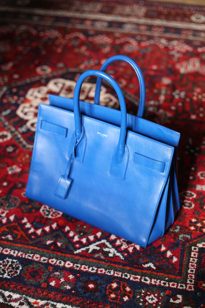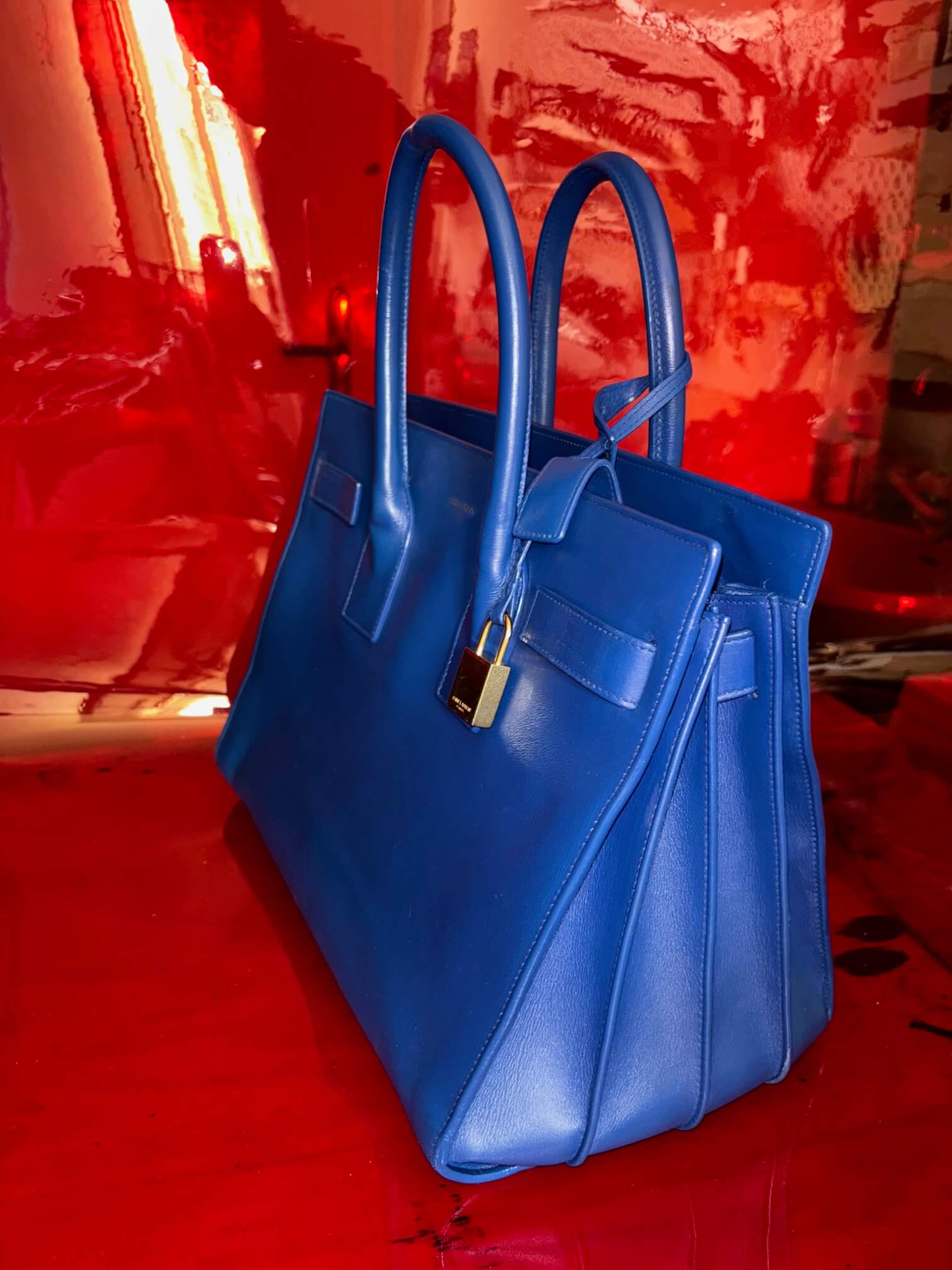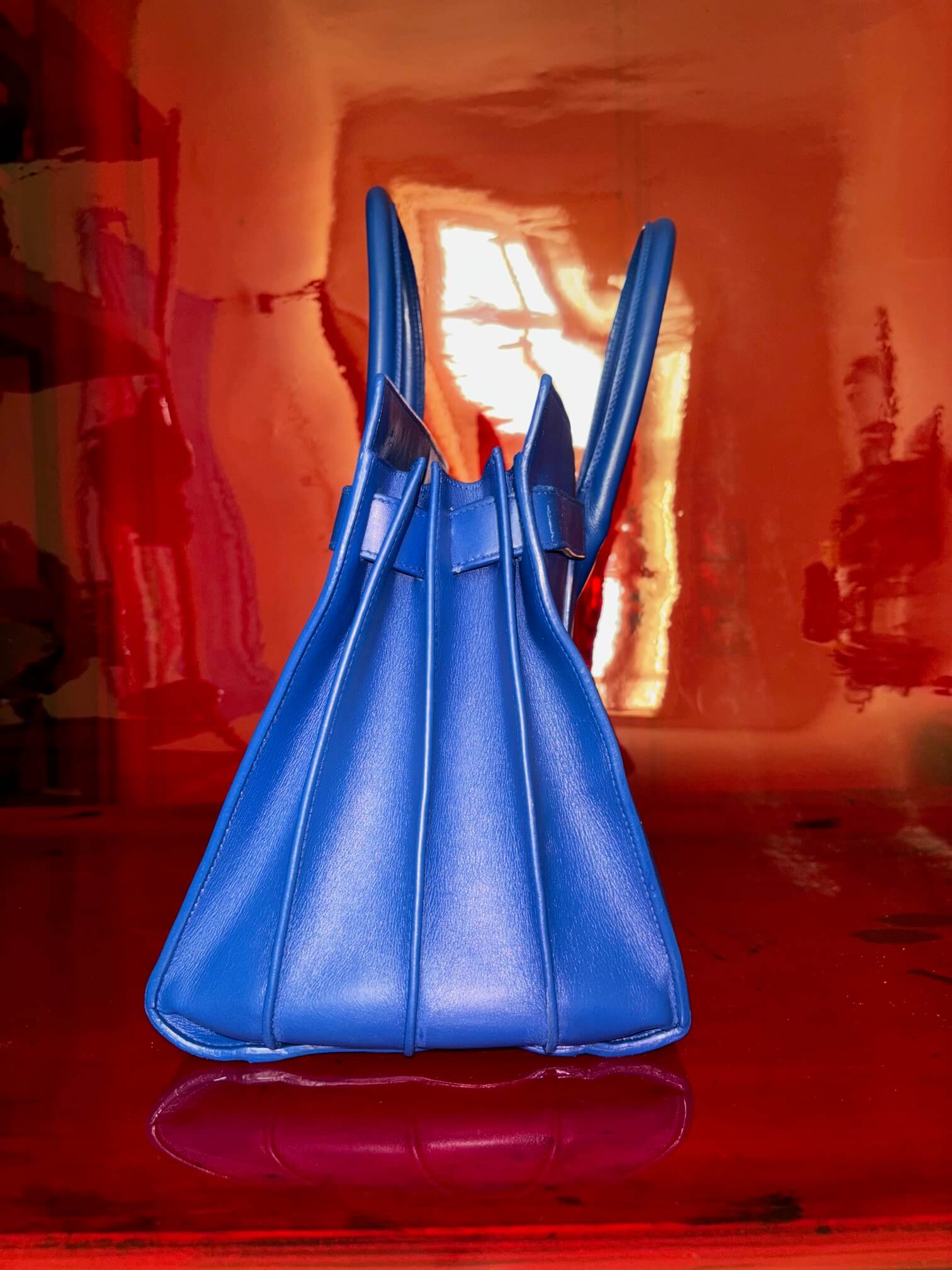 Saint Laurent Sac de Jour in Royalblau aus glattem Kalbsleder mit goldfarbener Hardware, Schulterriemen, Schloss, Schlüssel und originalen Unterlagen. Jahrgang 2014. Außen sehr gut, innen gebraucht – ein ikonisches Sammlerstück von Saint Laurent Paris. Neupreis 2.400 € – 2.600 €.